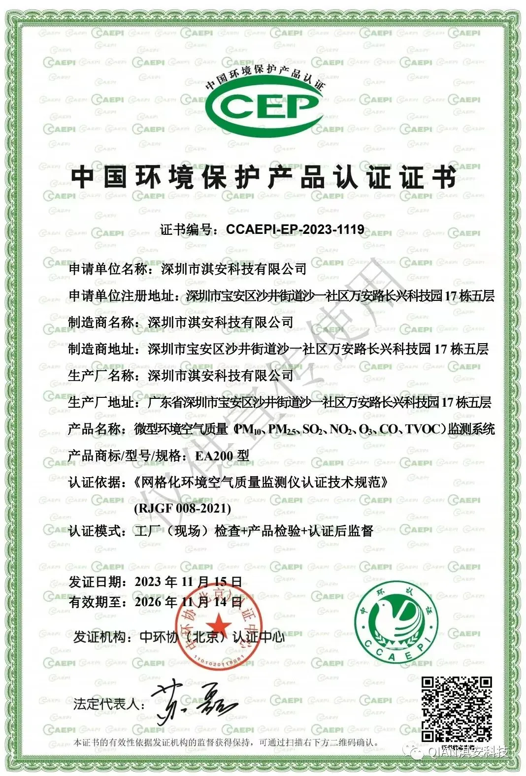 近日,深圳市淇安科技有限公司研发,生产的EA200型空气质量线监测系统经过实验室和现场实验测试,通过中国环境监测总站的严格认证,取得了由中国环境保护产业协会颁发的CCEP中国环境保护产品认证证书。这一荣誉不仅是对我们公司技术研发能力的肯定,更为大气污染监测添加新利器。